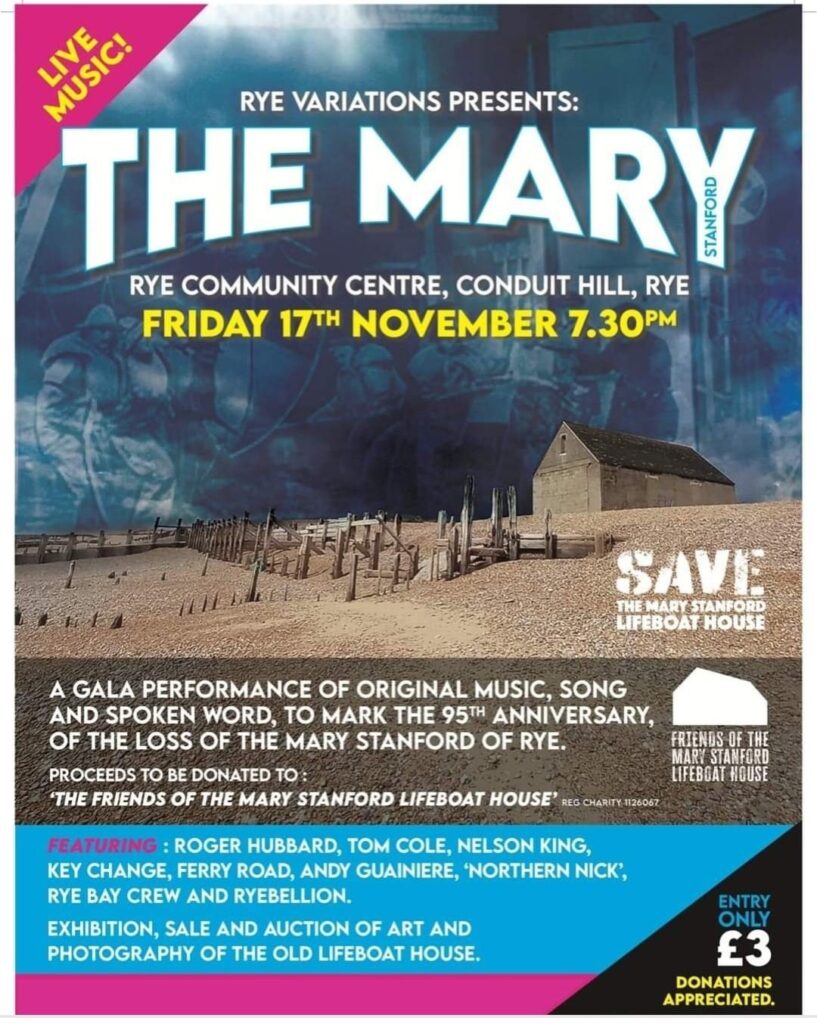 The next event is an exciting evening of music and spoken word to mark the 95th anniversary of the loss of the Mary Stanford lifeboat and crew, to be held on Friday, November 17 at 7:30 pm at Rye Community Centre. Performers include Roger Hubbard, the Rye Bay Crew, ‘Northern Nick’, and the Ryebellion Drummers amongst others. There will also be an auction of photographs and artwork depicting the lifeboat house.