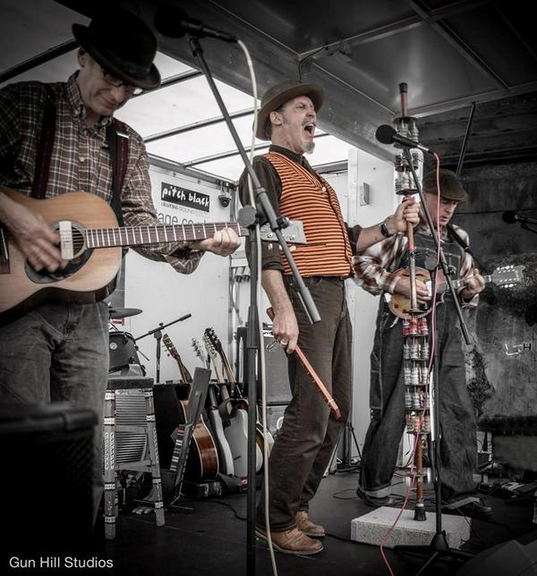 Dave Simner (banjo, lead guitar and vocals) who was brought up on diet of heavy metal and motorbikes, made his way to the coast and got involved in the Brighton music scene. He also has his own 60s R&B band, The Spectones, as well as leading music sessions for adults with learning difficulties. Tim Dunkerley (slide guitar, mandolin and vocals) is teacher/facilitator with Unified Rhythm, a samba/fusion marching band for young adults with learning difficulties.