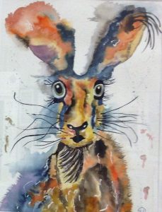 Set up in the spacious and light village hall, on a wonderfully sunny day, the visitor was given a warm welcome by some of the group’s members. This is a selling exhibition and some red dots showing sales could be seen around the hall. The exhibition, which does not include sculpture or ceramics, but did include other crafts, such as felt makers and silk scarves, had a number of beautiful flower and leaf studies, some by Kathleen Loughton-Meads in watercolour (pictured left), others in mixed media and some of local wildlife, like Hare two by Pat d’Warte. A real sense of fun in others of the paintings – Ladies who lunch and The Paddlers were two examples – gave the exhibition a quite different feel to the more serious ones lately reported on in Rye, but this in no way impacted on the quality of the exhibits. It was a real pleasure to visit.