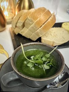 As you enter Fletchers, it feels the royal connection in history has been mirrored in the interior – lots of gold leaf, including throne-chairs upstairs in the function rooms. You can book these rooms for private gatherings. The layout is tables of twos and fours, and then through an open doorway, one table for six, and a few more tables of two and four. Tables with quality tablecloth, gold napkin holders with thick linen, and rather comfortable velvet-upholstered chairs. It’s a place which invites you in to settle, to enjoy, and to celebrate. The interior feels luxurious – thick carpet, richly upholstered furniture – creating some glamour, as well as ensuring noise is muted and conversation at your table is possible. This is in contrast to the modern trend of wood and metal in open-plan restaurants leading to noise bouncing around. Crisp white table linen and lovely large wine glasses combine to create the atmosphere that this will be a memorable meal experience.