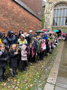 The Queen arrived at the town hall to be greeted by the school children on the path up to the church. She stopped to chat, posing for photos and collecting flowers in spite of the heavy rain, before heading into St Mary’s.