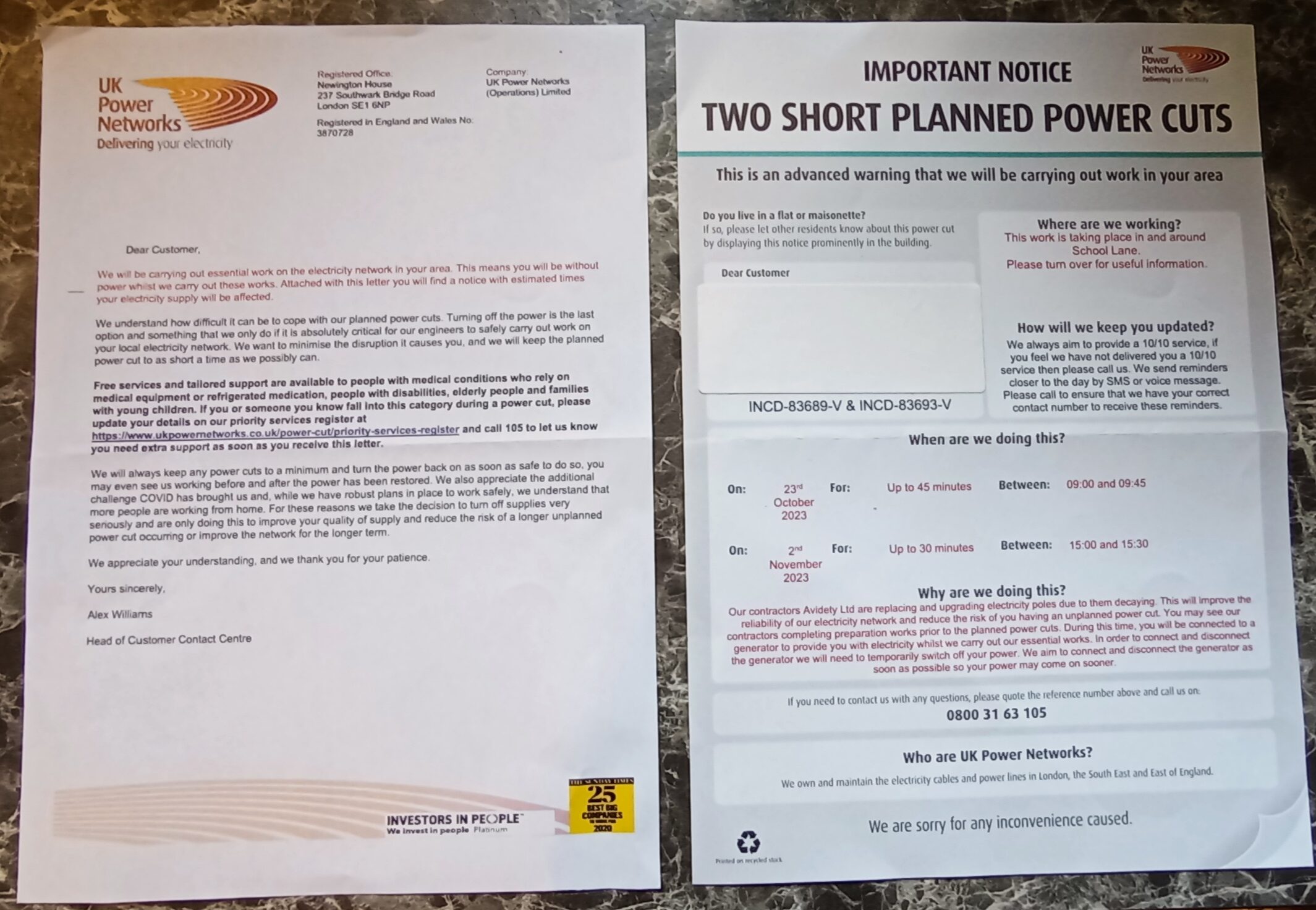 The first stage of this operation involved UKPN writing letters (see photo below) to all who would be affected by the planned power cuts as the old poles were removed and the new ones erected, explaining in lay terms what was going to happen, when and for how long.
