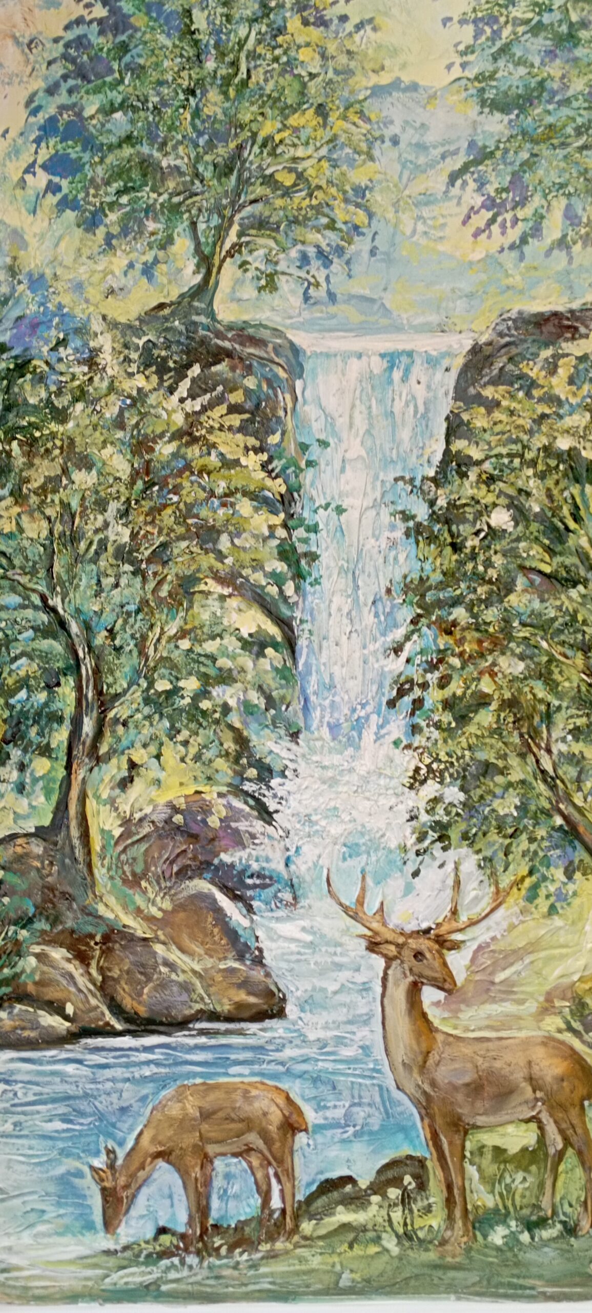 A statuesque figure of a man holding a trident is the next subject matter then a lighthouse perched on a cliff edge overlooking a calm sea with cascading waterfall. A galleon leaving the shore is another fabulous painting and a pair of deer resting and drinking from the rivers edge.