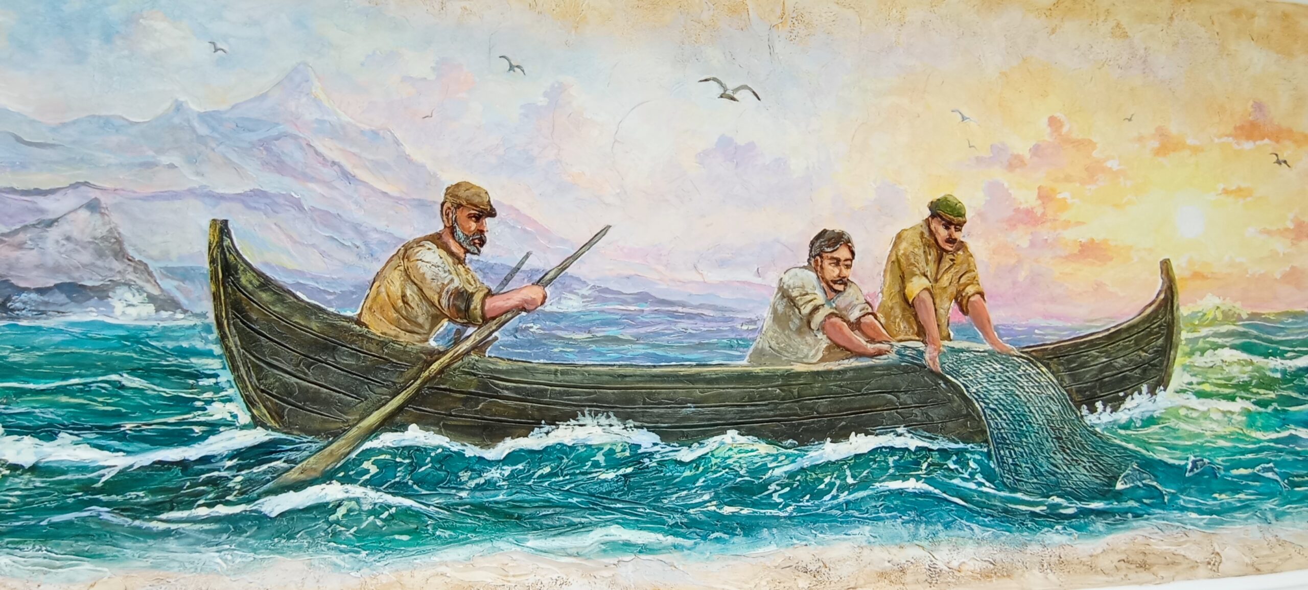 Two much larger friezes depict fishermen in their boats, hauling in their nets as the sun sets behind them then on another, a mythical mermaid adorns the foreground, lying on sand.