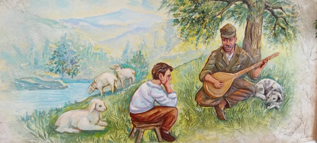 Further into the building is a scene of two women, making bread in the garden with a clay oven then two men sat amongst sheep overlooking a lake, one in deep contemplation, the other serenading him on a lute with his faithful dog beside him.