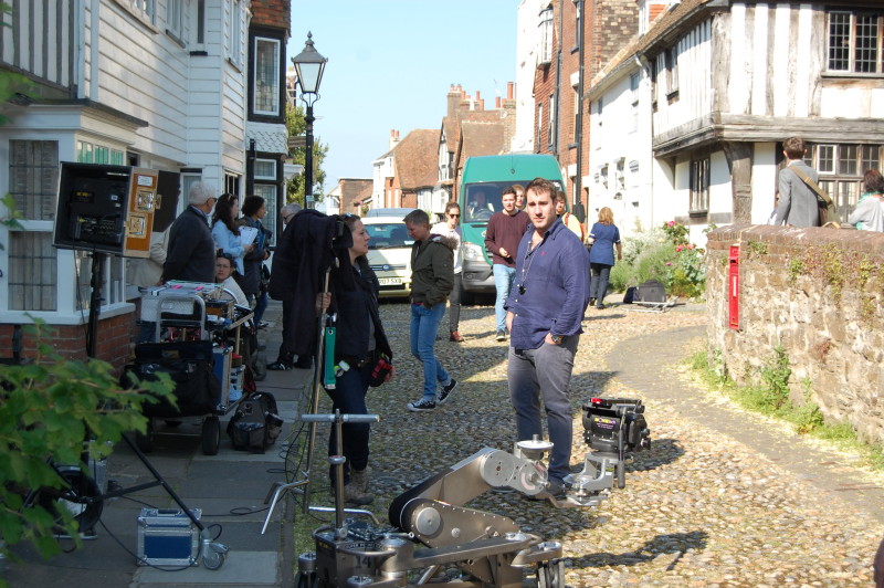 Thursday June 11: Church Square, Rye. Take One: Narrare film crew hard at work, 25 cast and crew. Fictional setting for “The Last Lighthouse Keeper”. About only privately-owned lighthouse in Britain at Happisburgh, Norfolk (pronounced Hazeboro’), decommissioned and bought by local community 25 years ago. One day shoot. Not quite up to BBC and “Mapp and Lucia” standards for traffic management it seems. Road apparently blocked. Pedestrian (in background) squeezes through. Not much of historic Rye actually going on film at this point. Typical film set scene. Everyone waiting for next bit of “action”. Cut.