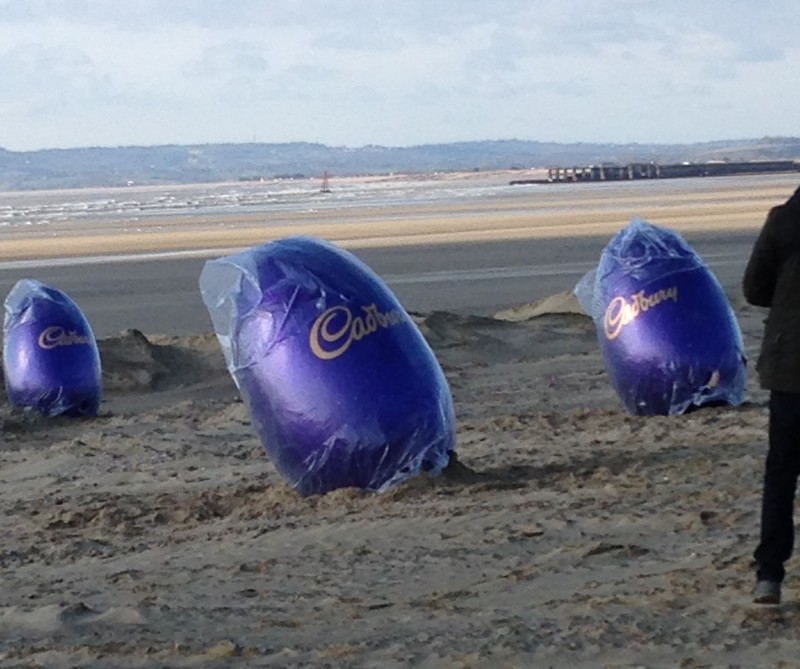 Four enormous eggs were deposited at Camber Sands last week, under conditions of extreme secrecy, writes Seana Lanigan. Each egg was eight foot high by four foot wide and weighed 25 kilograms. It transpired that this was a publicity stunt by Cadbury’s, in the run up to the annual chocolate festival frenzy, otherwise known as Easter. Photo: Carol MacDonald