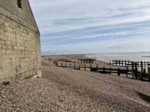 The former lifeboat house is in a prominent position above the beach at the Rye Harbour Nature Reserve. The building is a reminder of one of Rye’s darkest days in November 1928 when all 17 members of the Mary Stanford Lifeboat perished trying to rescue the crew of a stricken ship, the Alice of Riga. The boathouse was built in 1882 and has a concrete base built into the shingle which is now starting to be revealed – the recent storms have undermined the foundations of the building that used to stand next to it. Every year hundreds of tons of shingle are moved from near the harbour entrance back along the coast protecting the shore from Fairlight to the nature reserve.