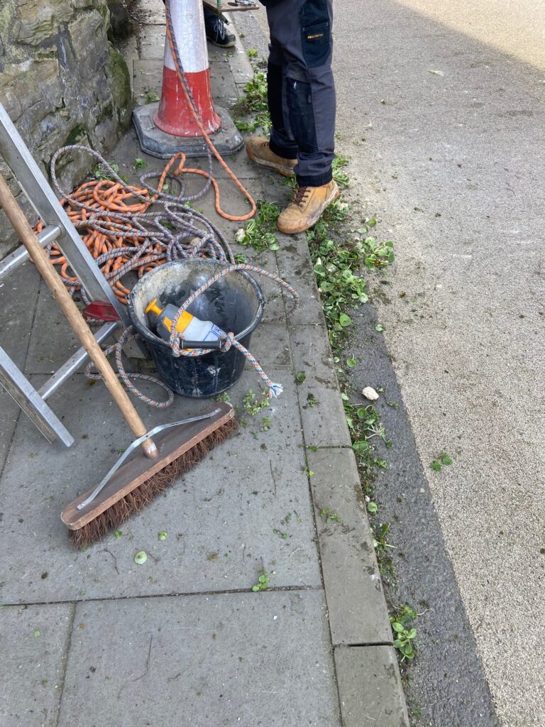 One man was competently wrangling the traffic from Cinque Ports Street while the other, dangling but securely held by ropes, cleaned moss and green foliage off the stonework around the clock. On the day they had cleaned up the other side: they were doing a beautiful job.