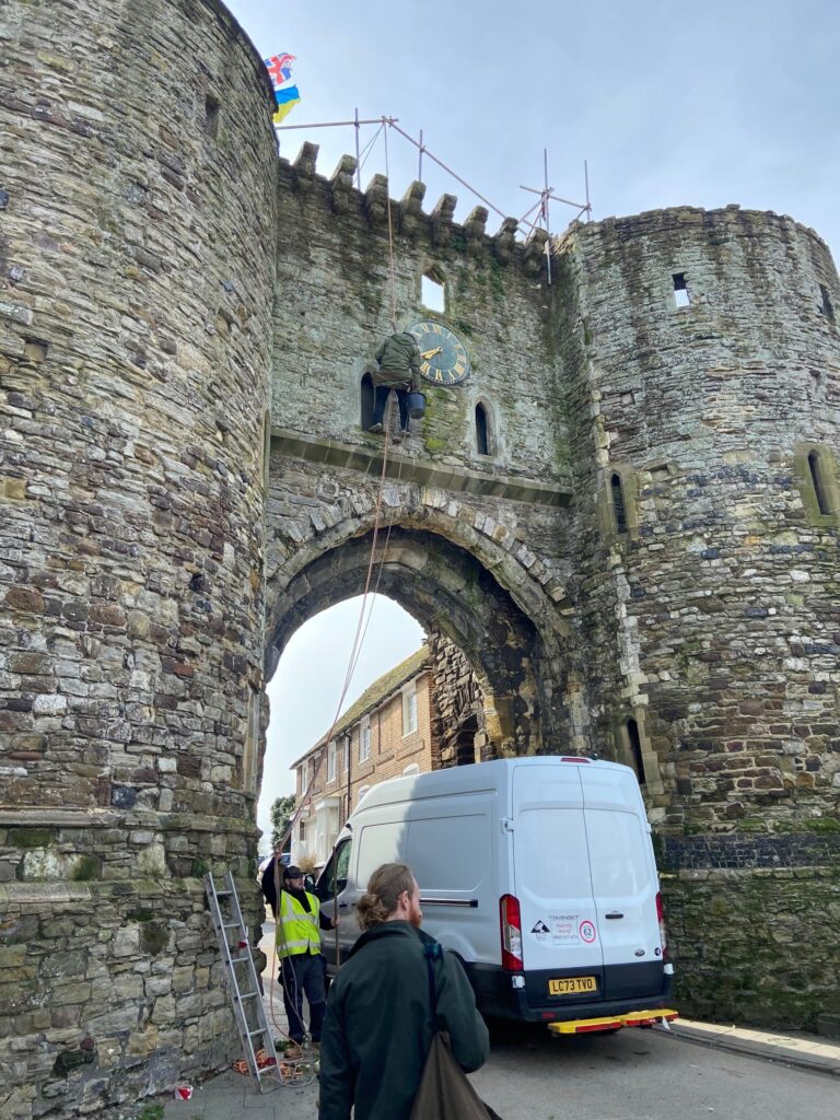Thanks to regular Rye News contributor Isabel Ryan for sending in this series of photographs taken last Tuesday March 26, showing the two-man cleaning team in action removing foliage from the Landgate.