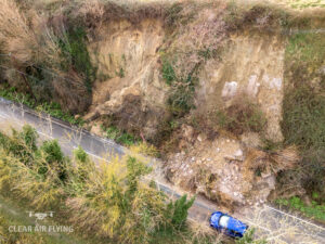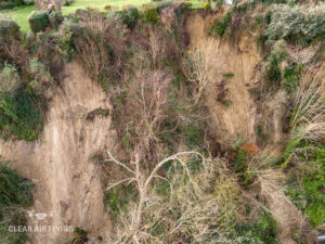 Meanwhile drone shots taken by Stuart Cooper from Clear Air Flying in Winchelsea have revealed the extent of the damage caused by the landslips. The pictures and video show the large cracks in the cliff face, fallen trees, the piles of mud and rock, and also just how close the cliff edge has come to properties on Point Hill.