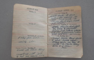 The tiny diary has a week across two pages, with some fascinating detail. For example on April 16 1945 he writes “travelled til late afternoon. Don’t know here where we are. Saw a dogfight. Wrote to my darling.” Over the Easter weekend in 1945 he says: “North of Munster. Shell fire. First time. Not liking.”