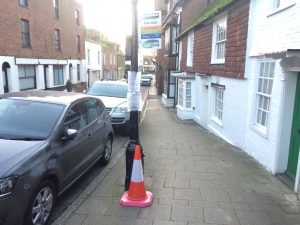 Tower Street: unlike most of the street the pavement on this section of Tower Street is wide and ESCC seem to be proposing that it is located next to the curb and not up against a historic building. In addition it will be located next to a lamp post – which could provide the electricity to power the meter rather than relying on irregular sunshine to power the solar cap. Of all the locations in Rye, this one seems the least problematic – so why not look for similar opportunities elsewhere?