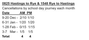 Using their own data on the main morning school train from Hastings to Rye arriving at 8.47am and the return service at 3:48pm in the afternoon, the students found eight trains were cancelled over a 50 day period up until the beginning of March. The cancellation rate of almost ten per cent was also checked against data on the On Time Trains website. There have been no cancellations affecting school services for the last month.