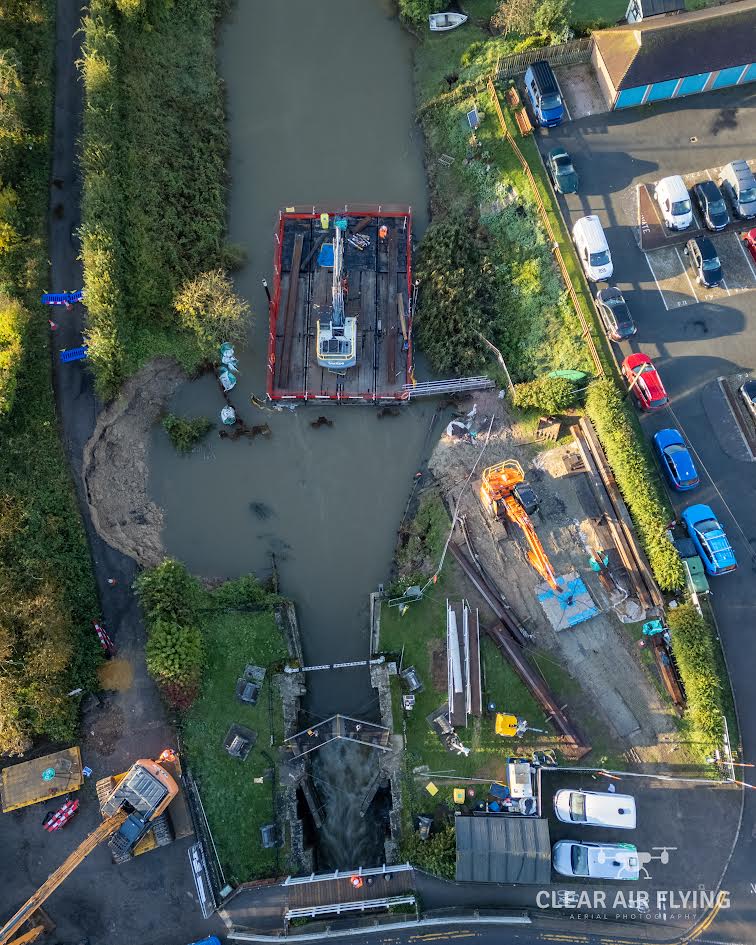 Drone shots taken above Brede Sluice show the extent of the bank collapse following last Thursday night’s storm. Emergency repairs to the river bank and restoring access to Castle Mill Cottages has been taking place all week, with the Environment Agency (EA) describing the structure as “failing.”