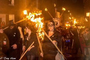 The drums and flaming torches always make this a dramatic sight with painted faces – sometimes a little macabre – and many societies opting for 18th century dress, adding to the effect.