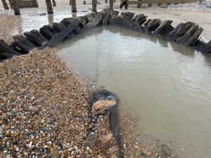 The storms and high tides have unveiled another wreck at Broomhill Sands near Camber. The wooden boat, roughly ten metres long, can clearly be seen amongst the shingle near the groynes towards the outfall drain. Wooden posts have also been unveiled by the changing sands.
