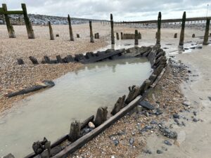 In 2016 another wooden ship became visible further along the beach towards Camber. Archaeologists from Historic England identified that as an eighteenth or nineteenth century ship, possibly from North America.