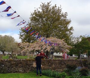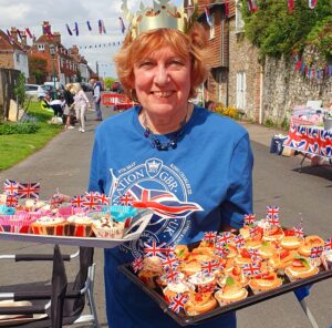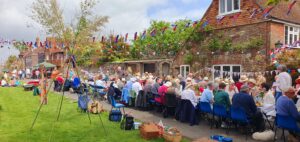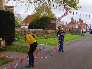 And so on Sunday, May 7, we held a huge street party, to mark the coronation of His Majesty King Charles III. We started with 120; this was dictated pretty much by the number of tables and chairs available from the New Hall. And then it went up, so we requisitioned tables and chairs from St Thomas’. And then it went up, so we raided the Court Hall. We finished at around 225, plus picnickers on the verge.