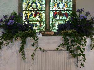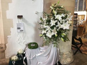 Moving on to the arrangements, at the entrance was a stunning display of white lilies and purple alliums with cow parsley , by St Mary’s bell ringers to celebrate the 200th anniversary of “three bells and a sance belle” in St Laurence, Appleton Church Tower, (near Abingdon, OX13 5JS,) Society of Change Ringers.