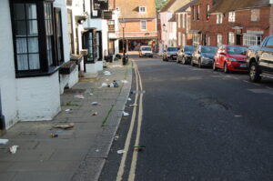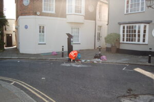 Rother District Council has been made aware of the problem and their street cleaner is generally promptly on the scene. This morning he was there scooping it up within 15 minutes of the refuse vehicle’s collection. This should not have to happen though, so what else can be done? Issue free hessian sacks? Pass a by-law fining misconduct as for littering?