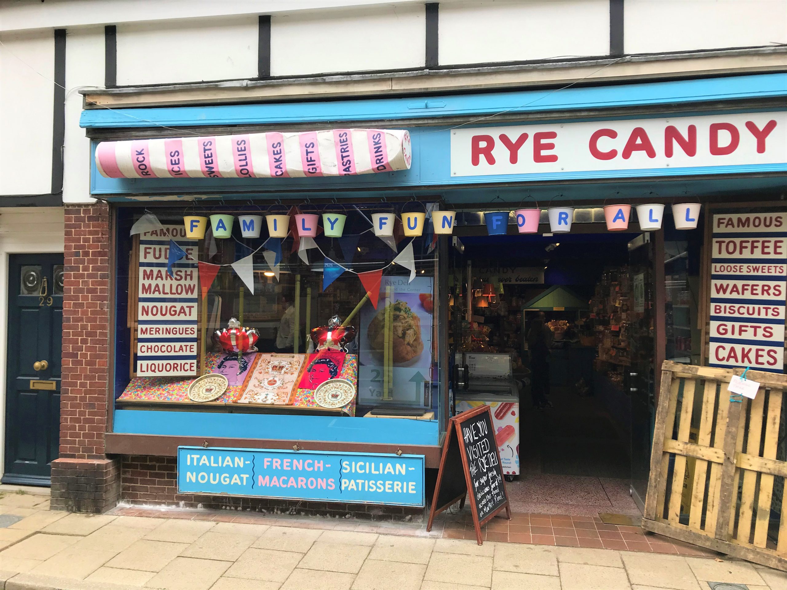 Wandering through Rye on Sunday we could see, as well as the many Union Jacks and patriotic bunting on display, our shops are also beginning to join in with some themed window displays. Rye Candy on the High Street have gone for a regal display with crowns, tea towels, posters, bunting and trays (see photo below) whilst on Cinque Ports Street, Needles Antiques have a lovely old fashioned display full of royal memorabilia, Union Jack bunting and a full wedding dress with regal sash – brilliant!