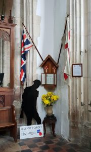 This year there have been numerous national and regional Remembrance commemorative events, including art installations; an effort to recruit 1400 bell ringers (number lost in the First World War) to support a countrywide peal of bells on 11 November; a commemoration of the “Hundred Days Offensive” at a special ceremony at Amiens Cathedral; a muster of 1100 standards of the Royal British Legion at Ypres. The Rye standard was amongst them to replicate the Great Pilgrimage of veterans to Ypres in 1928.