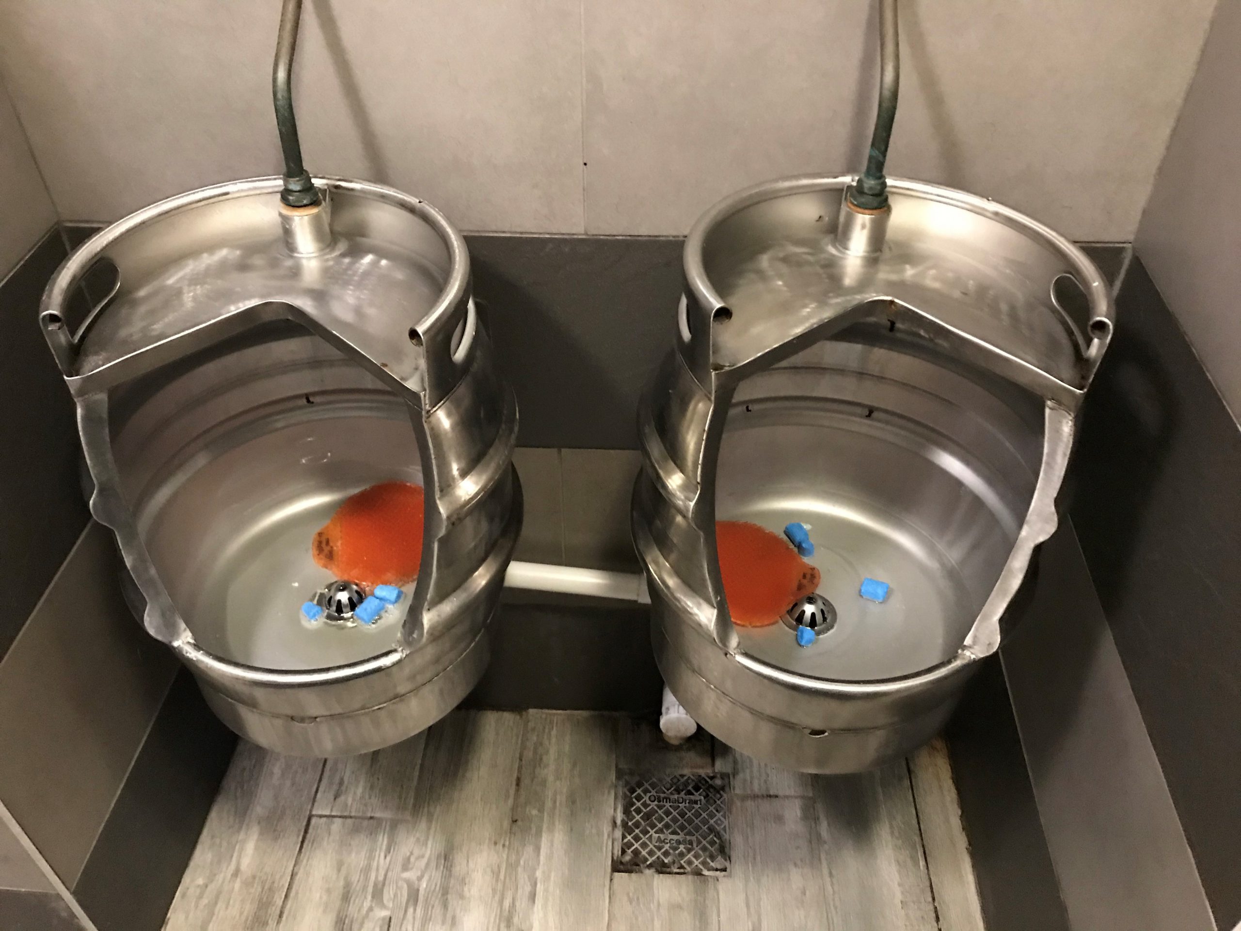 The second image is the hand flush at The Waterworks in Rye, an ingenious use of a beer pump to flush the system, cheekily labelled ‘Doombar’ and created by local, Tim Morgan. The main photo is of the gents at The Bell Inn at Ticehurst where the urinals are a trio of old European tubas where you can have a tinkle (sorry, couldn’t resist that one) and the last image is another ingenious use of old beer barrels which have been repurposed as urinals, at The Ship Inn, Shaftesbury.