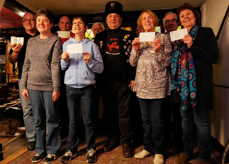 Wednesday night was a little different. It was time for the Rye & District Bonfire Society to help other local “good causes”. As well as collecting for the expense of bonfire night itself, the society gives money to local groups and December is the time for dishing it out. Recipients had been suggested back in the summer; 10 were approved and seven were – with bonfire society members – squeezed (literally) into the back room at The Queens Head, Landgate, to receive their cheques.