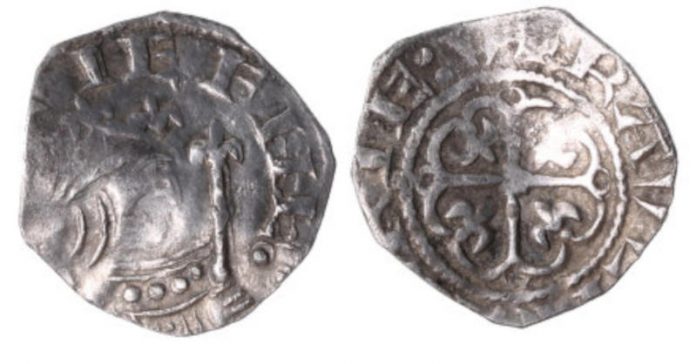 On one side is bust crowned and diademed holding a sceptre in right hand with the inscription [ST]IEFNE or Stephen. On the back is a cross moline with fleur on each angle and inscribed RAVLF: O [N]: RIE:V