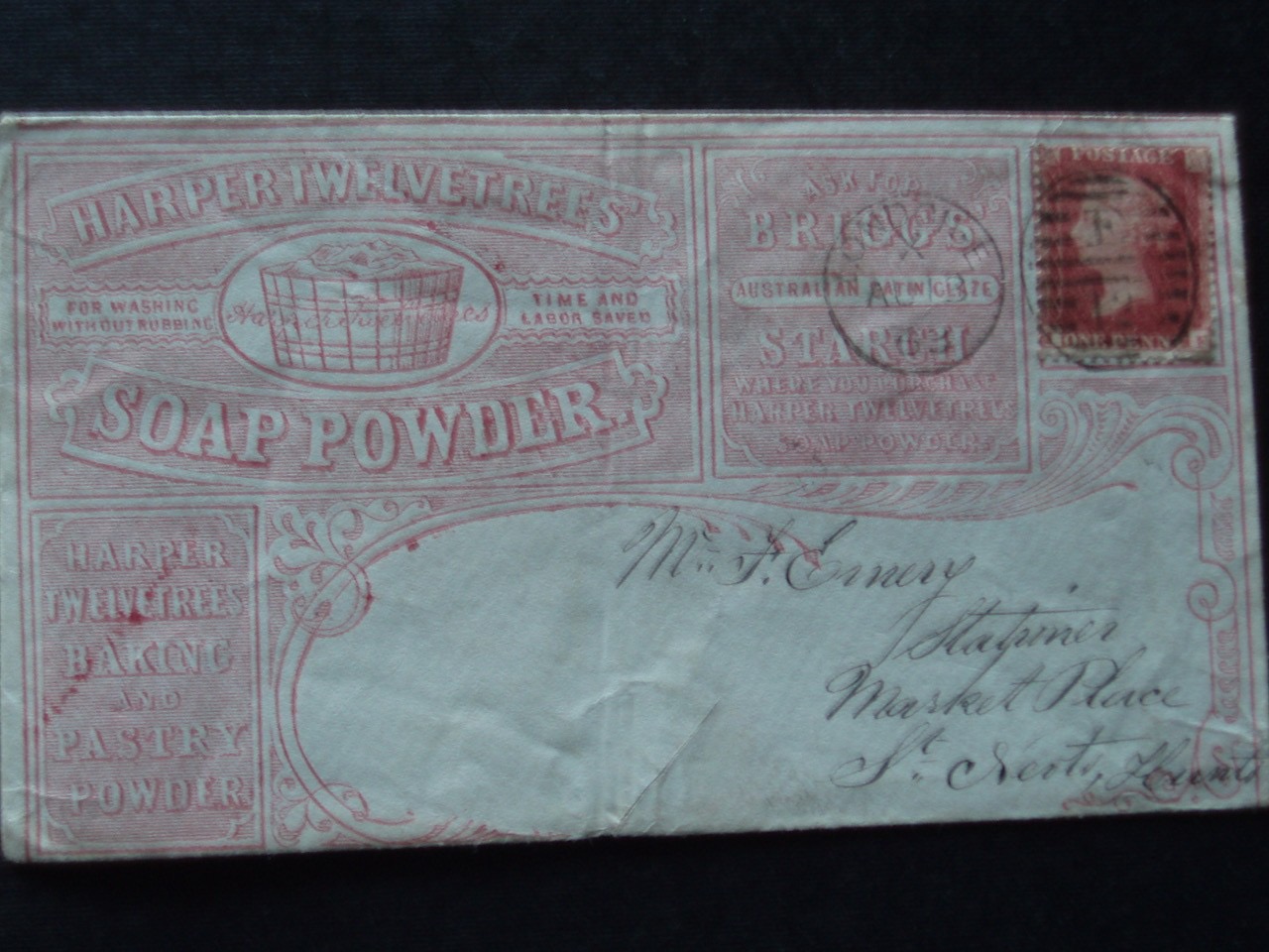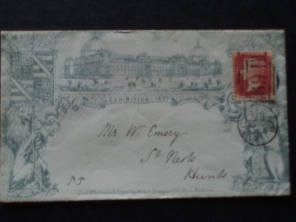 However fortune did shine on me at a furniture auction one day. Lotted up in a glass case were a bundle of Victorian postal advertising envelopes which I thought were interesting especially as one was from the Great Exhibition of 1862 (I was not aware that there had been two the first in 1851). Being in a furniture auction I thought that there would be no stamp collectors in the room and that I might, perhaps, pick the lot up for £20 or so. The bidding commenced and rose rapidly to £50 and then stuck at £60 at which point I kept my head down. The auctioneer continued calling £60, I looked up, and found he was looking at me to see whether I was prepared to go to £60 – which I reluctantly did, cringing and hoping bidding wouldn’t go any higher, at which point the hammer was brought down. So with a bill of £60 plus buyers premium and VAT I went home with my purchases.