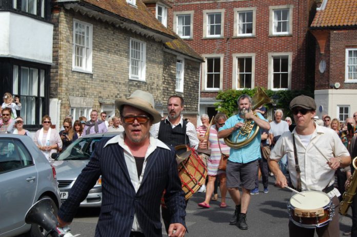 Come Monday Bank Holiday afternoon, there was still a good crowd in and outside the Butter Market at the Town Hall, being regaled by the Mark Harrison Band. His number “It’s tribulation time” had good drum backing and was well applauded. Was this listener alone in thinking the amplification unnecessarily loud? For my money (and free public performance art doesn’t cost a lot) the strutting, megaphone-waving, leader of the Fat Tuesday 2nd Line Band took the biscuit.