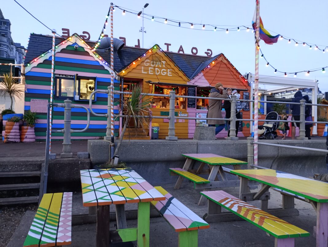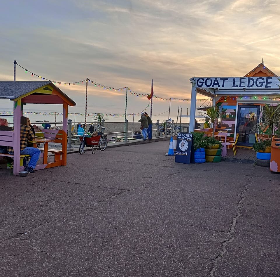 The Goat Ledge, on Lower Promenade across from Warrior Square, St Leonard-on-Sea, TN37 6FA is well worth a special visit when strolling along the beach. It has little huts to sit in if windy with tables actually on the beach and provides coffee, tea, locally caught fish and full seaside menu.