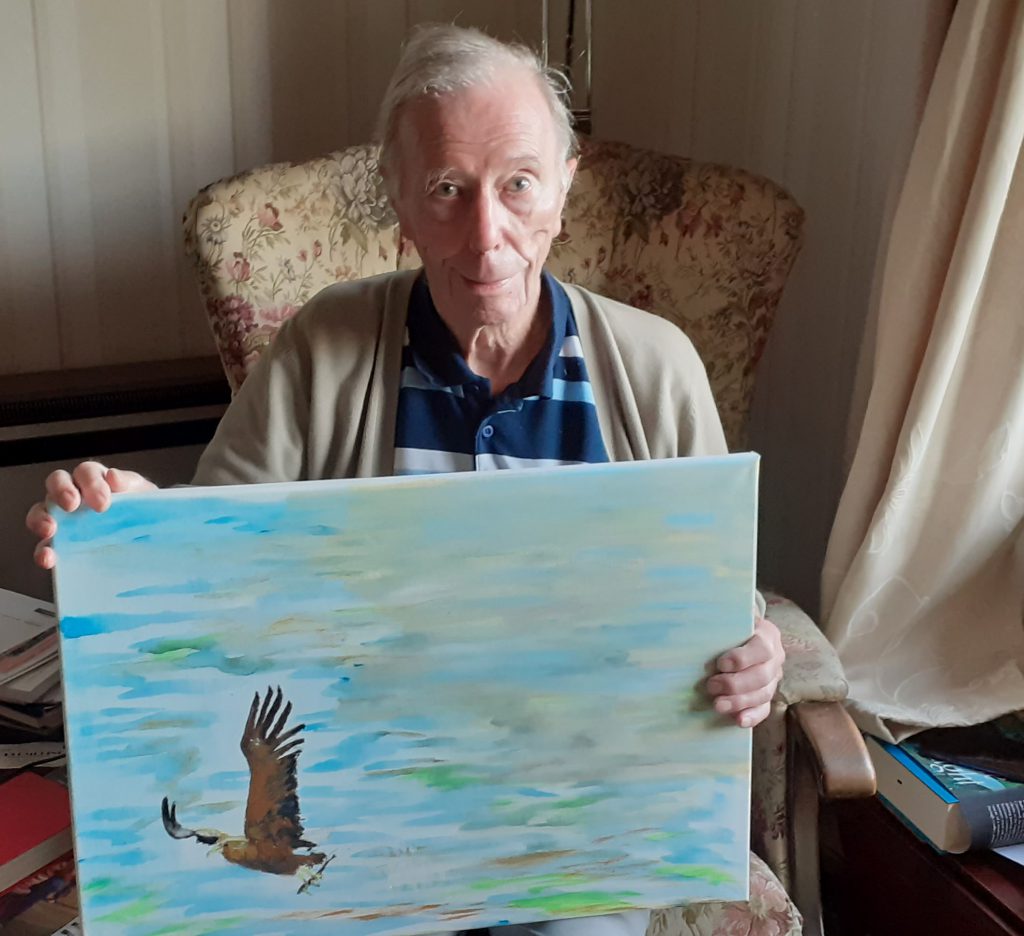 Archie, at 96 says he is open for any new art form and while initially he worked with watercolour, the course has encouraged him to use oils and combine abstract with figurative images. He says: “Covid restrictions have not diminished my energy and I continue to use my time to paint and write each day”.