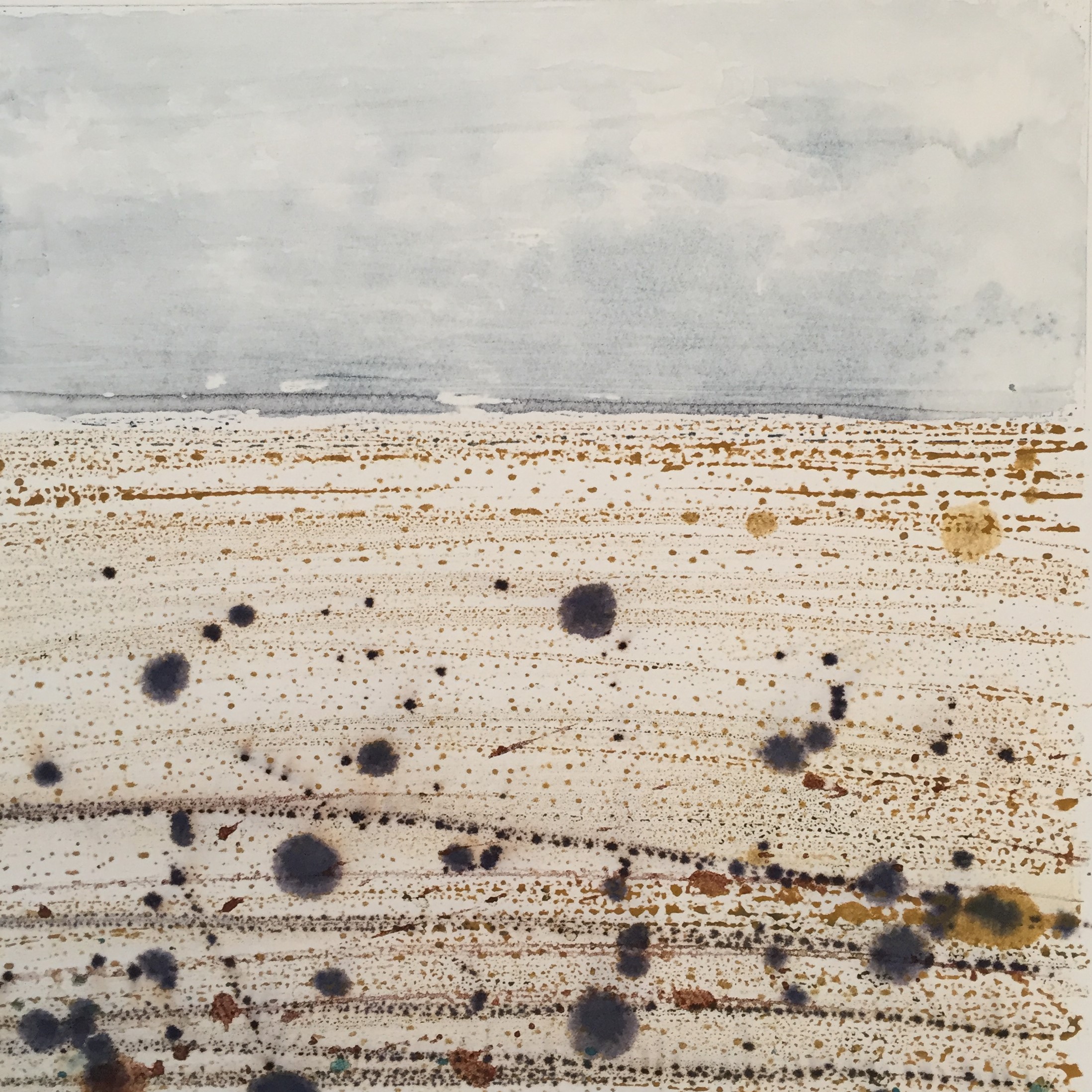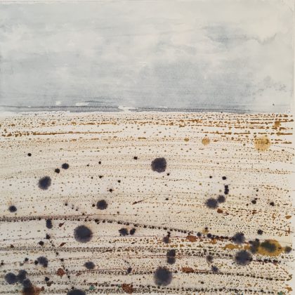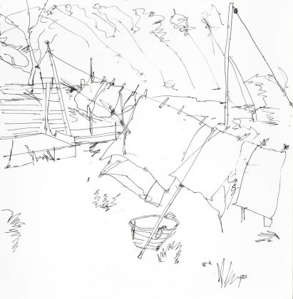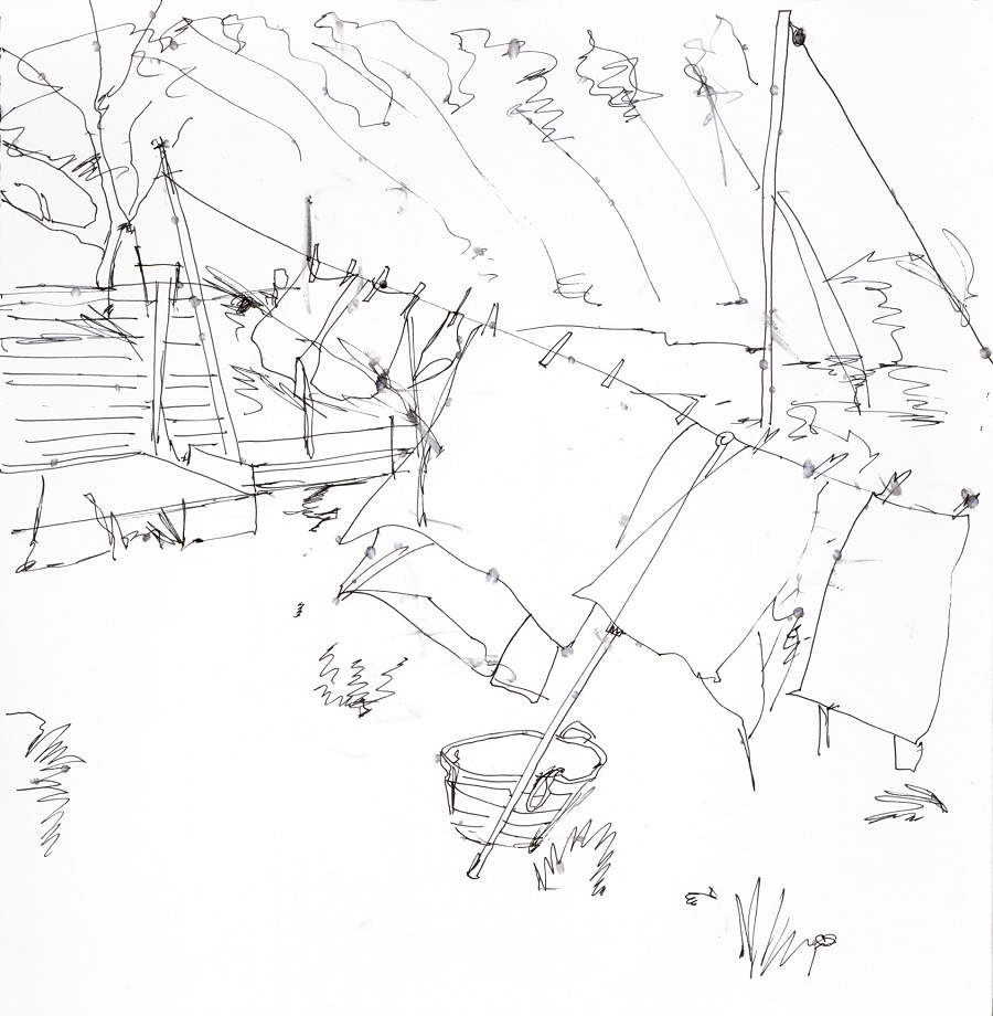 “We live in Rye Harbour, the garden forms part of the Rye Harbour Nature Reserve. I was sitting on the garden table in October last year, drawing the washing line, bit of a breeze, keeping my focus on the blowing washing and not on the paper, it started to rain lightly which account for the little blotches on the paper. I stopped the drawing then. The rain blotches add interest.