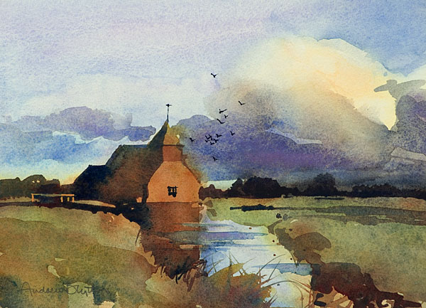 Andrew is well known for his watercolours that are inspired by his love of light, atmosphere and movement. “I enjoy the architectural uniqueness of Rye with the mix of styles going back over many centuries. The relationship with the landscape offers a lot of variety for artists. I love the Romney Marsh churches and each one stands out as a piece of sculpture in the landscape – particularly Fairfield”. His paintings are figurative: townscapes, marshes, sea, still life and floral and, more recently, animals.