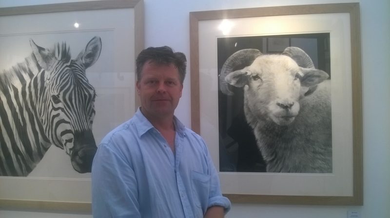 The Rye Art Gallery opened a new show on Saturday October 14, the main exhibit being animal portraits by Will Taylor. Locals and new faces mingled with a glass of wine, admiring the details of the charcoal drawings of the variety of animals. (pigs, sheep, monkey, badger and more) each with its unique expressions of irony, fun or thoughtfulness. As one visitor said: “It feels as if all the eyes are following you”. Will said he draws from photographs and used the cows outside his studio as models. Now living in Rye, sheep are frequent subjects. For this collection Will has also included other animals which he had met on his travels in Africa and India. The large charcoal drawings explore tone and texture taking the usually-immediate and loose medium to another level.
