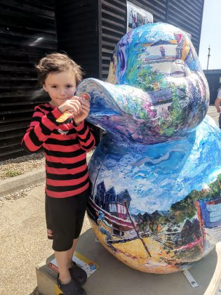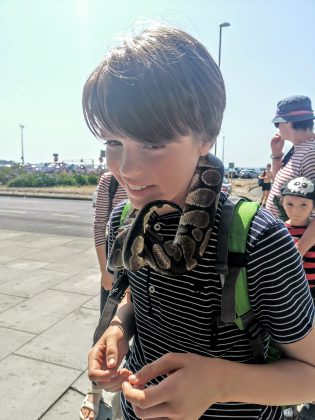 We started by spotting a man with snakes, who kindly let our eldest Luca (a twelve year old snake fanatic) hold them. Luca thinks they were a red rat snake and a royal python. He said he could feel their muscles moving around his neck – exciting! We then met our friends to listen to live music behind the café Eat@the Stade. We all went to the fun fair, trying the pinball ride, where my youngest son shouted the whole way “We are not going to make it!” but we did. It was so hot that we went swimming in the sea at Rock-a-Nore.