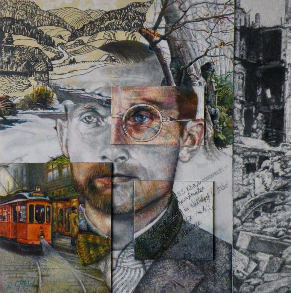 In his series of paintings, Finding Mathias, David Crew explores the connections between the past and present, between his family and a German PoW artist, Mathias Hess, and between East Sussex and Germany. It is an amazing story, told in the paintings and in text alongside the paintings, and in the catalogue, The Mathias Connection. They are well-worth reading as they detail the almost magical connections that have enabled David to tell Mathias’s story.