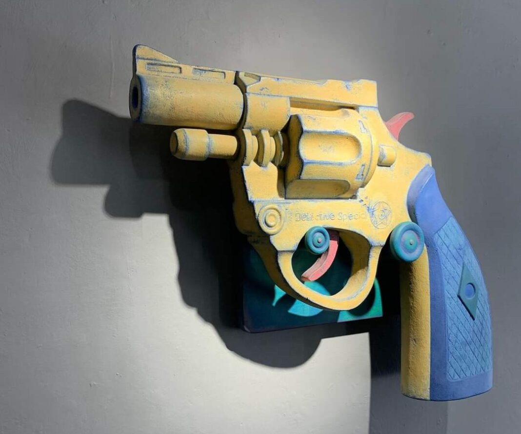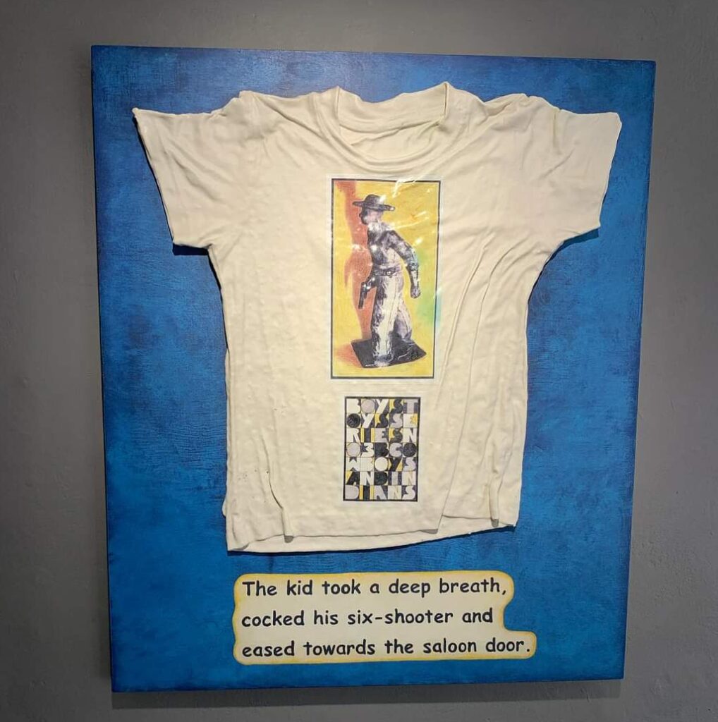 Not only are the objects themselves symbols – there are heads of people and animals, an army tank and toys and games from childhood, but many are covered with symbols and patterns – numbers, letters, computer code. It is hard to believe that some of the objects are ceramic, Toy Gun and Cowboy Teeshirt are so skilfully rendered.