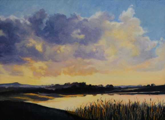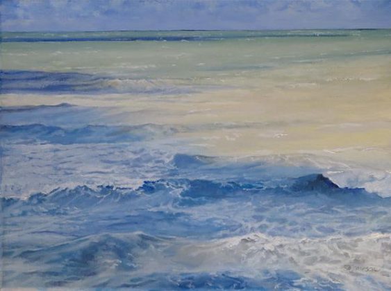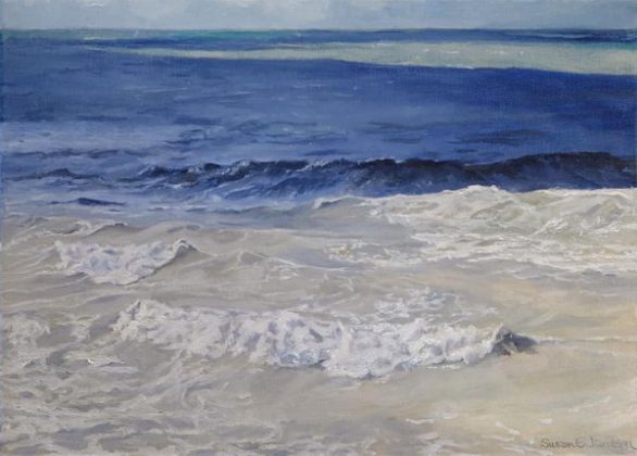 Sue’s inspiring engagement with the natural world was established as a child growing up in the Lake District. Now living on the coast, her recent paintings take inspiration from the sea. Sue delights in observing the water and is fascinated by the constant lunar cycle of transient tides. The theme of her newest work is the changing interplay of moonlight and sunlight on the water’s swelling and rippling surface.