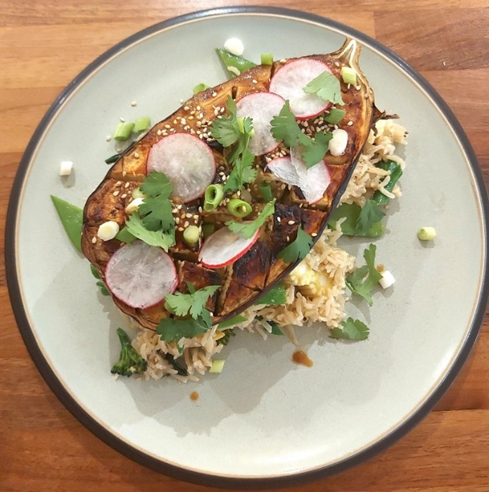 - Whilst the aubergines are in the oven, cook your rice and stir fry your vegetables. Mix together once cooked.