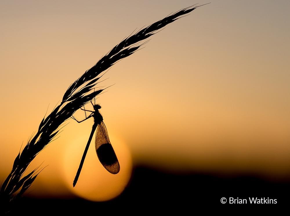 The image was taken one evening when Brian had been photographing a wild barn owl and was packing up his kit at the end of the session. It turned out to be a lucky chance encounter. He noticed the banded demoiselle roosting on a piece of grass. The setting sun was a perfect backdrop and the silhouette worked perfectly.