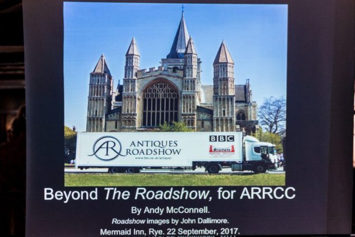 Invited onto the BBC’s Antiques Roadshow, he quickly became a fixture and an acknowledged expert, despite his unconventional approach and throwaway humour, almost street theatre. He claims to have brought rock journalism to glassware and has been given free rein by the producer to “do his own thing”. He gave an insight into the Roadshow and what makes it so successful in the TV ratings. As a professional performance it involves some 150 people at prestigious venues like the British Museum, Chatsworth and Wimbledon, for example. He showed us a slide of himself on the sacred Centre Court, racket in one hand and wineglass in the other.