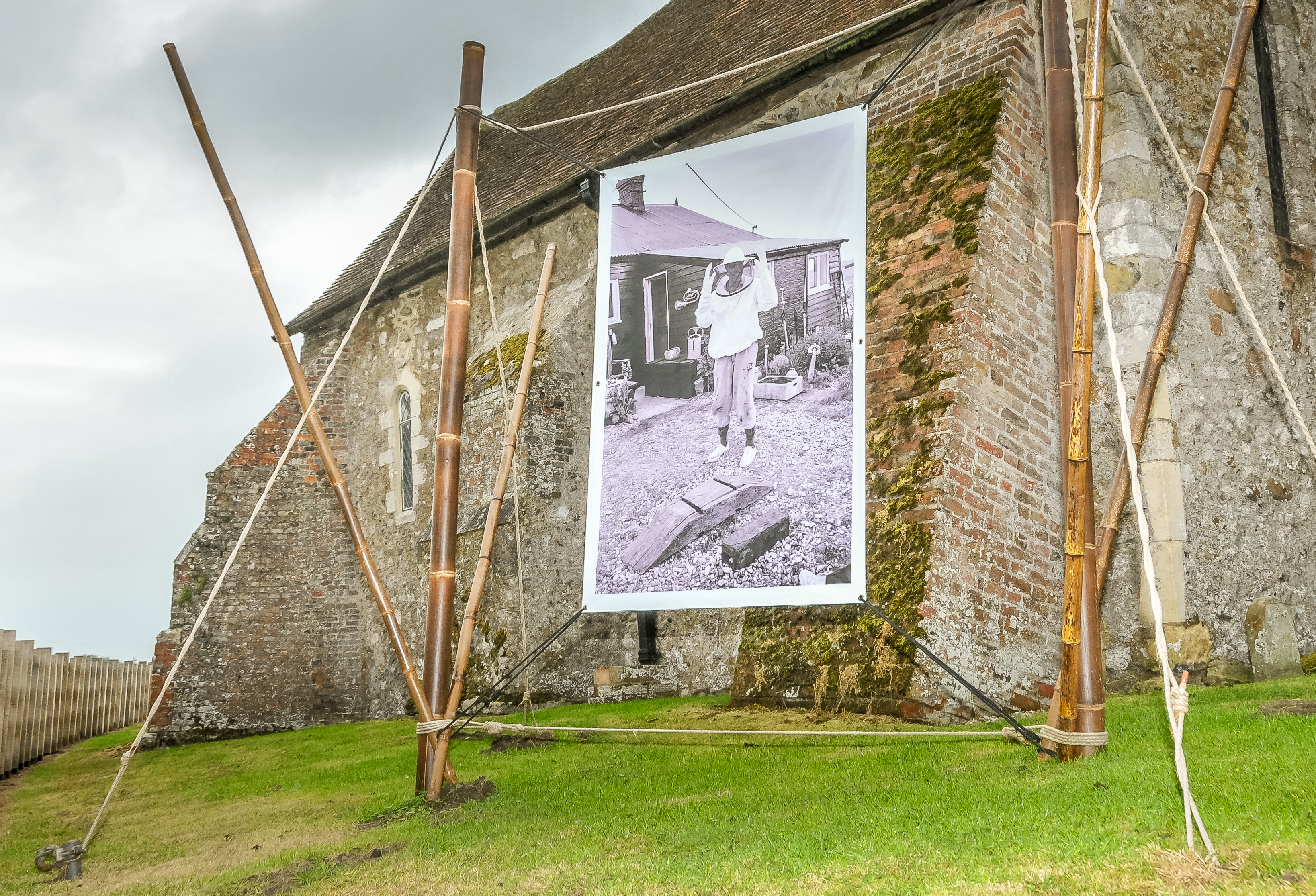St. Clement’s church in Old Romney featured the work of Fay Goodwin. Renowned for her black and white landscape photography and her passion for campaigning for public access to the countryside, her intimate portrait of Derek Jarman in a beekeepers suit was taken in his garden at Prospect Cottage, Dungeness.