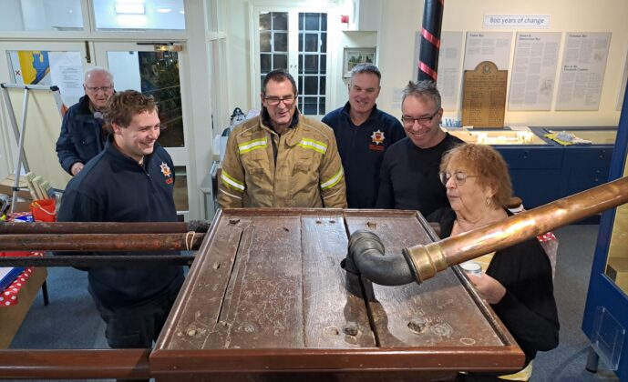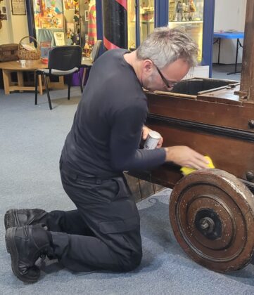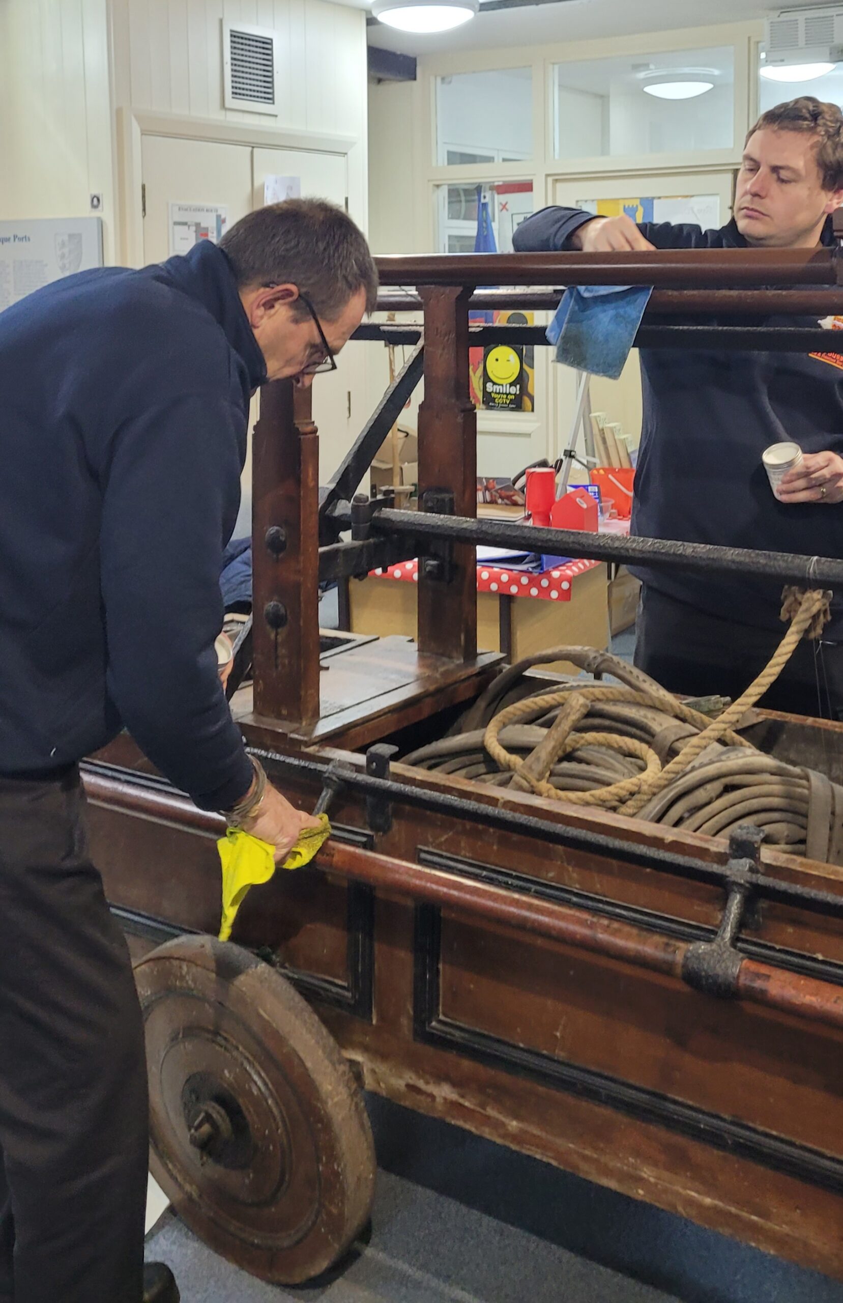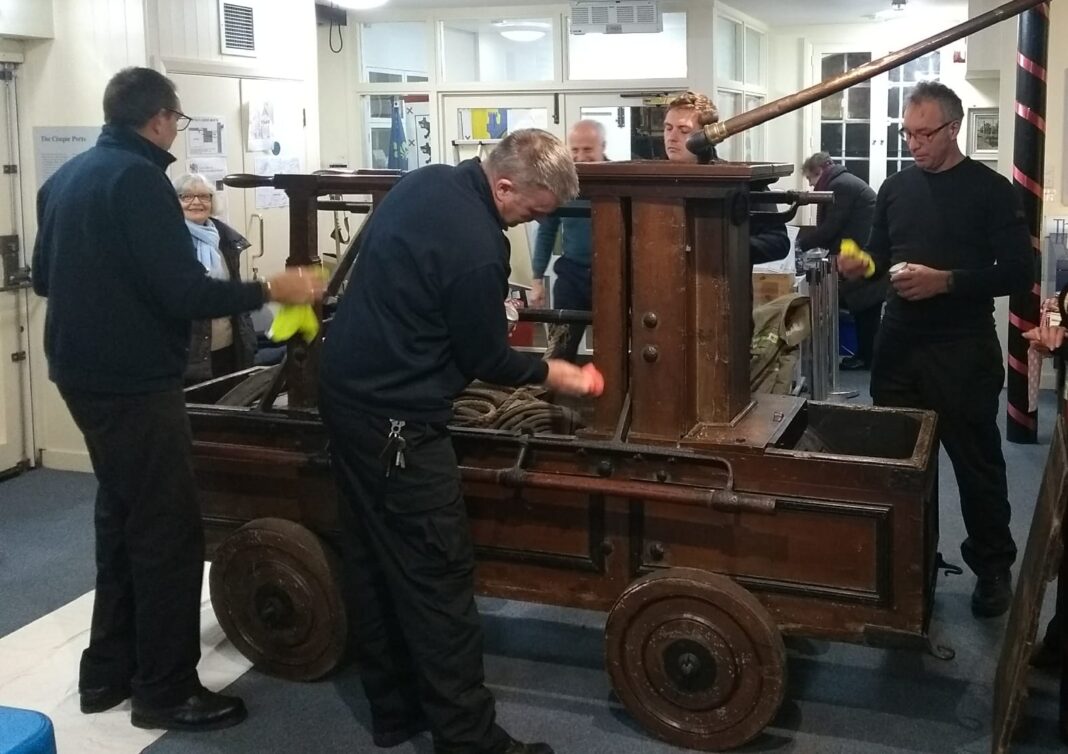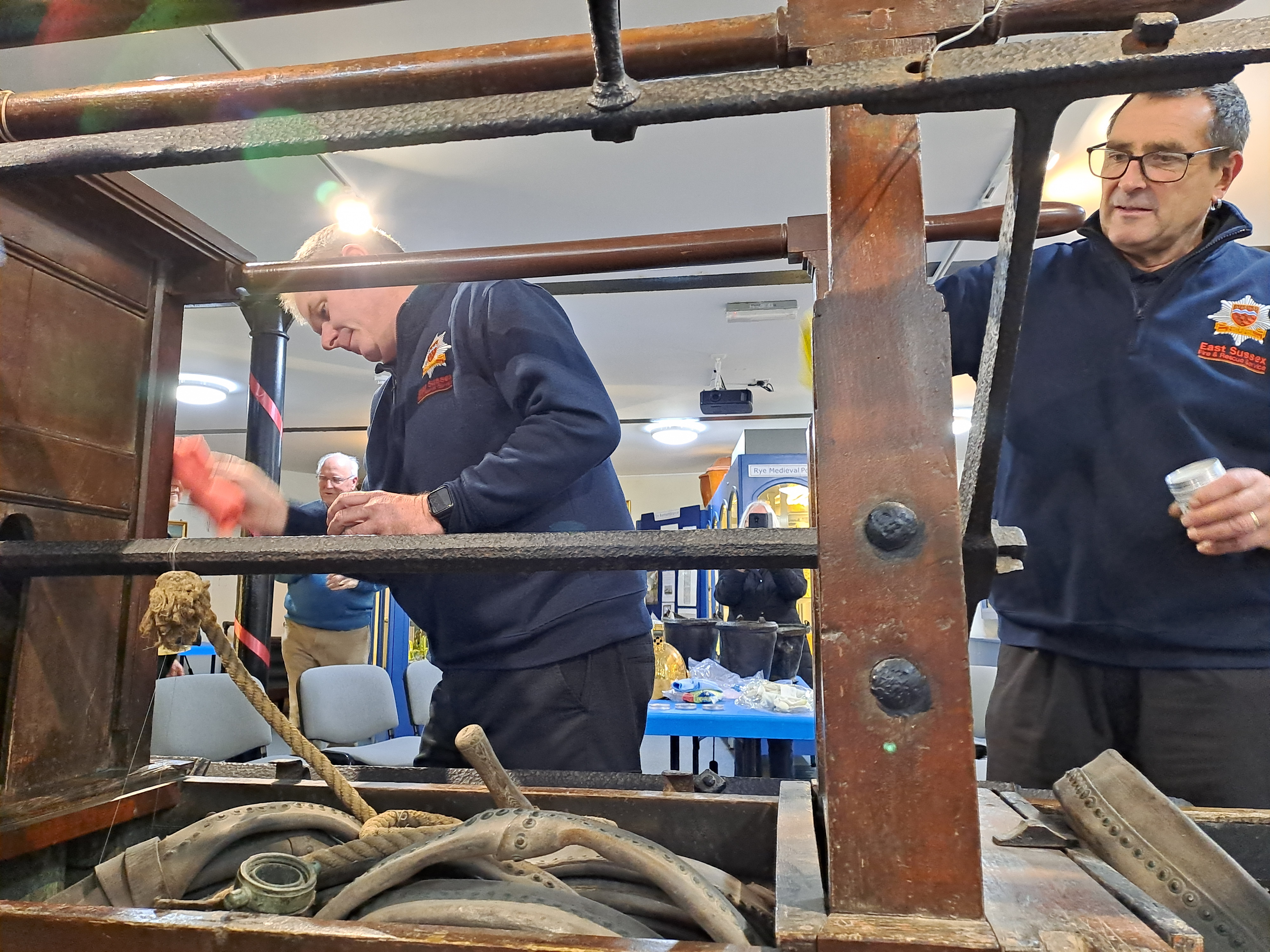 So on Tuesday, November 19, the museum was very grateful for the help of several members of the local fire service who came from Rye fire station, to clean and wax the museum’s 18th century fire engine (see A history of Rye through museum objects). John Booth, Pete Ashbee, Neil Thomas and Graham Butler offered their services and were busy using Renaissance wax to clean and refresh the wooden fire engine, fuelled by hot drinks, sandwiches and cakes supplied by Jen and David Tomkinson.