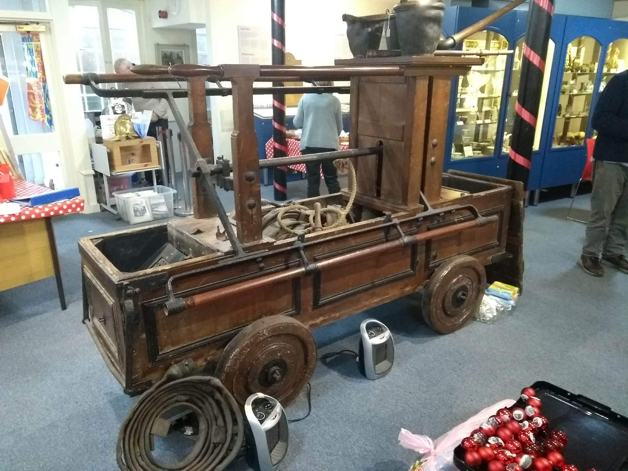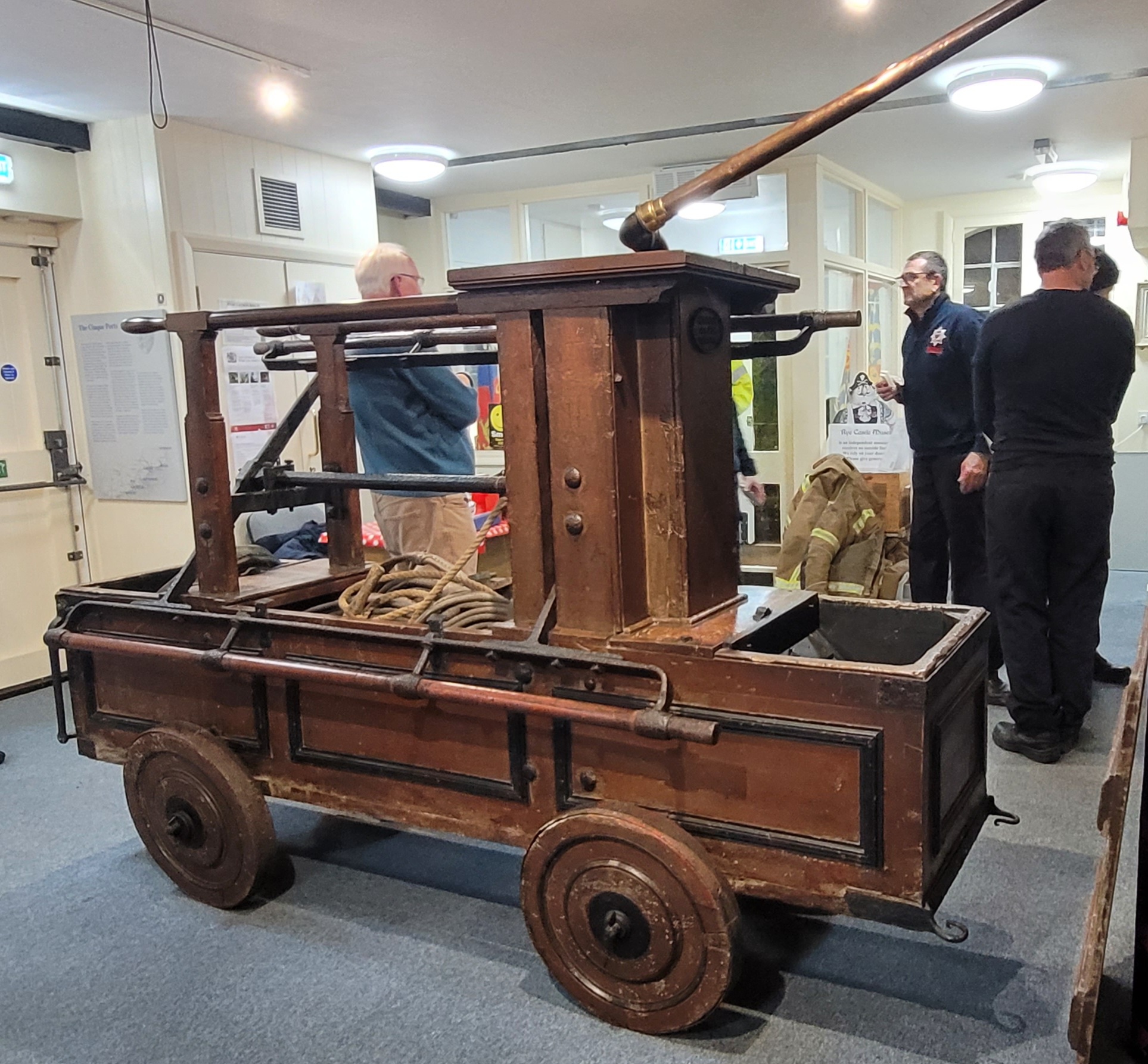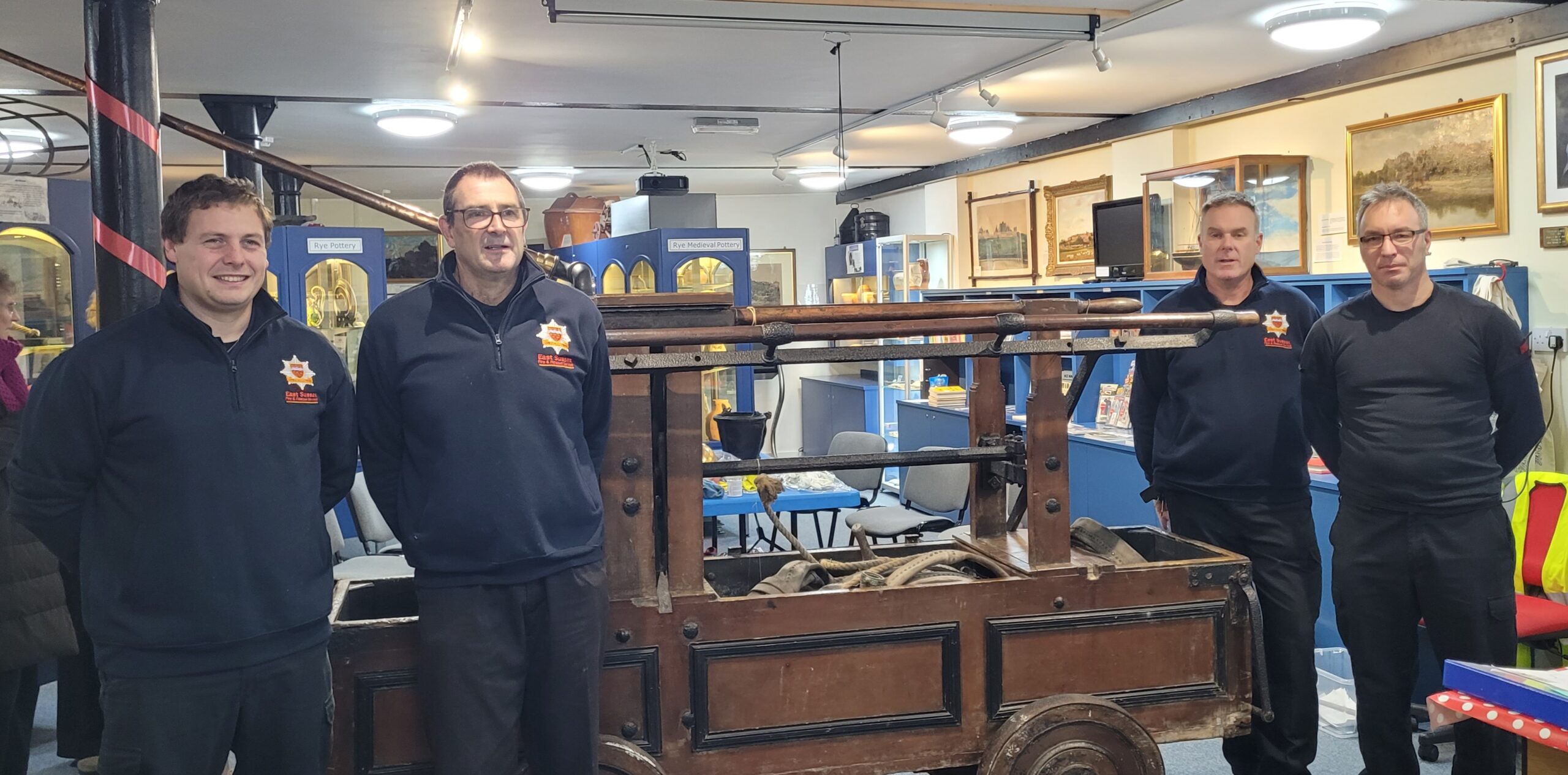 So on Tuesday, November 19, the museum was very grateful for the help of several members of the local fire service who came from Rye fire station, to clean and wax the museum’s 18th century fire engine (see A history of Rye through museum objects). John Booth, Pete Ashbee, Neil Thomas and Graham Butler offered their services and were busy using Renaissance wax to clean and refresh the wooden fire engine, fuelled by hot drinks, sandwiches and cakes supplied by Jen and David Tomkinson.