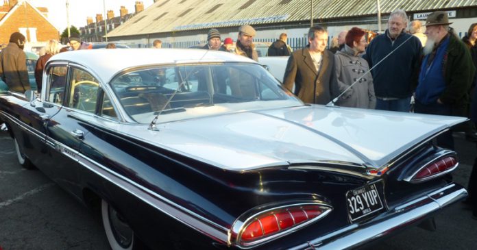 The car cruise is one of the highlights of the twice-yearly Rhythm Riot weekends held at Pontin’s in Camber. The weekend attracts devotees of the 1950s music, fashion and lifestyle as well as fans of Americana and some of the costumes and hairstyles are truly eye-catching. You can expect to see lots of men sporting slicked back hair (local shops are sure to sell out of Brylcream) and woman in seamed stockings, dance dresses and bebop blouses.