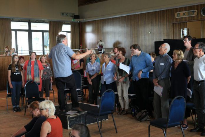 Howard Moody is an internationally renowned conductor and composer and plays numerous instruments. His music for this opera is emotional and powerful for the orchestra and us off-stage choir. Simon Torio, the director of the on-stage actors, both adults and children playing guards, resistance fighters and prisoners, is a genius. We are all non-professionals, apart from the soloists dotted about in the choir and main characters, (some from Glyndebourne) yet Simon Torio brought forward amazing performances from all the community people and children from Hastings schools.