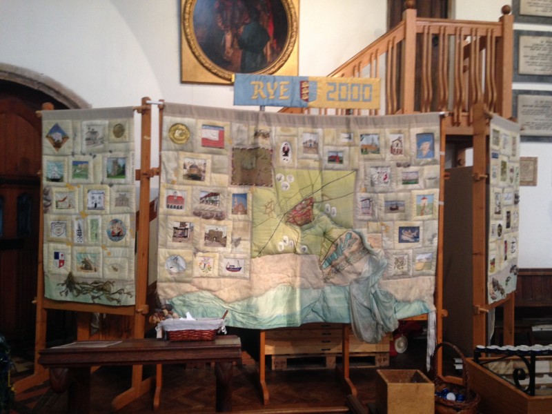 Large scale examples of their work can be seen on the ground floor of the Ypres Tower Museum (commemorating Rye’s history) and in St Mary’s church (below – marking the millenium).